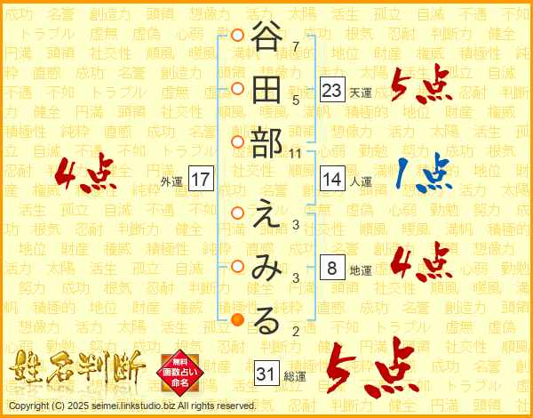 生活面を象徴する運勢です。外部から受ける影響力を表し、結婚運、家庭運や職場、環境への順応性を表します。総運から人運を引いた画数。姓や名が1文字の場合を除く。