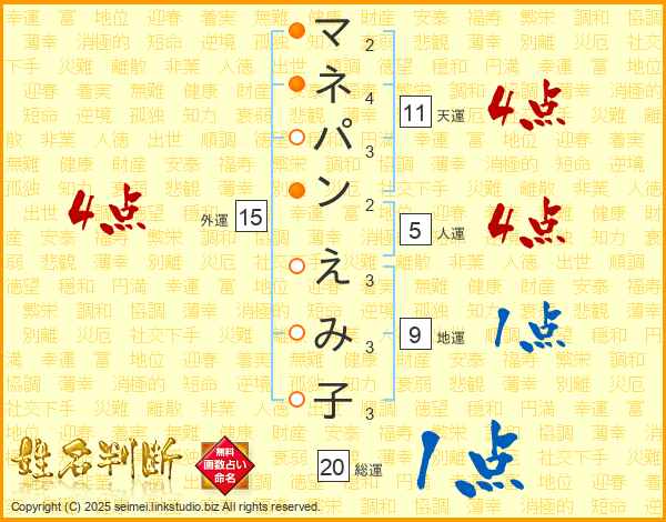 マ(2画)ネ(4画)パ(3画)ン(2画) え(3画)み(3画)子(3画)