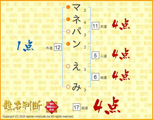 マ(2画)ネ(4画)パ(3画)ン(2画) え(3画)み(3画)