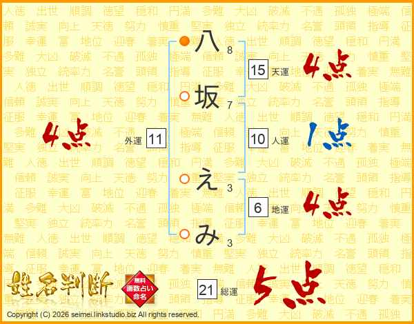 八坂えみさんの総運は21画の5点!