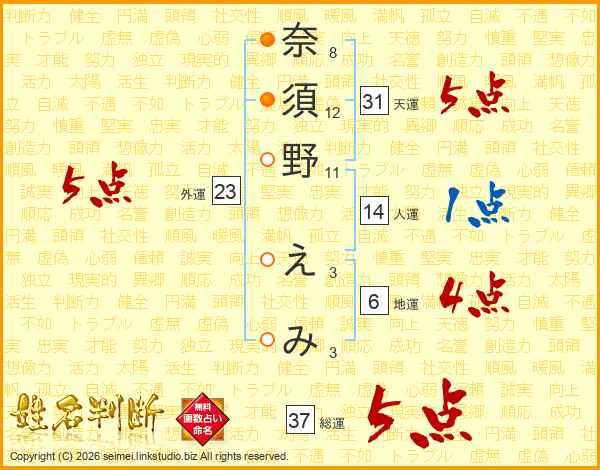 奈(8画)須(12画)野(11画) え(3画)み(3画)