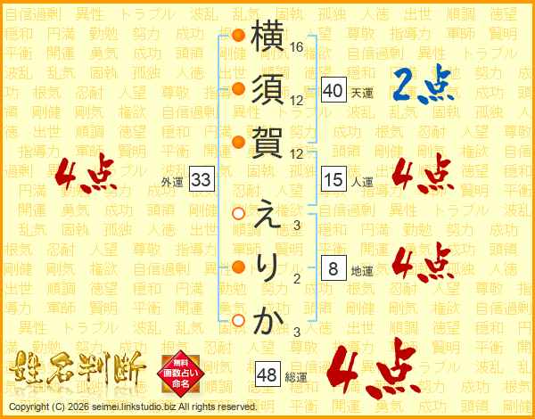 横(16画)須(12画)賀(12画) え(3画)り(2画)か(3画)