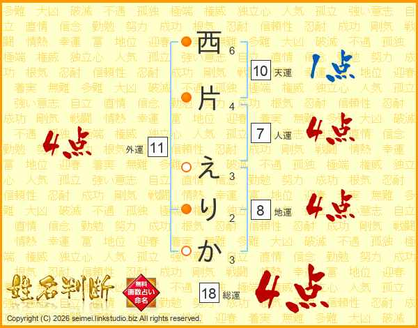 西片えりかさんの総運は18画の4点!