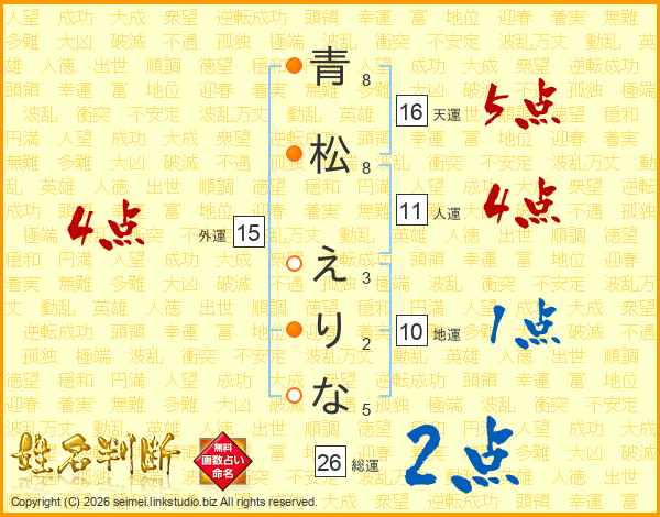 あなたの人生を表す1番重要な運勢です。生涯を通じて影響する総合運となり、主に50歳以降の晩年期に影響を及ぼします。苗字と名前の合計画数。