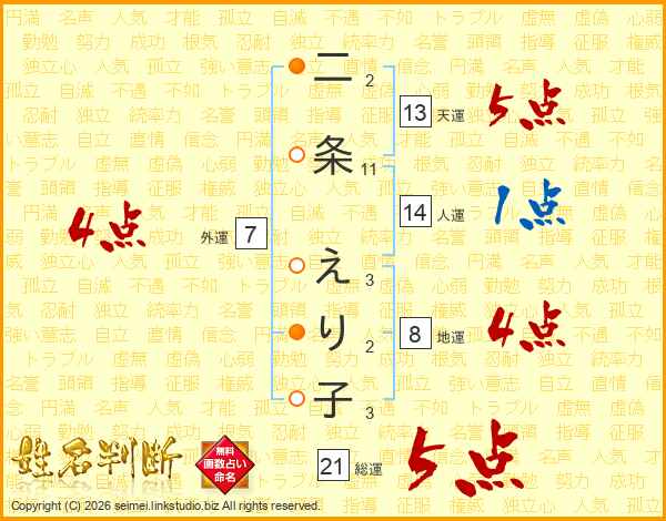 二条えり子さんの総運は21画の5点!