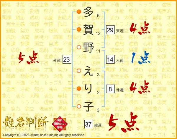 多賀野えり子さんの総運は37画の5点!