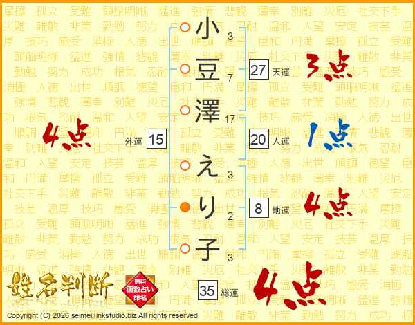 小豆澤えり子さんの外運は15画の4点!