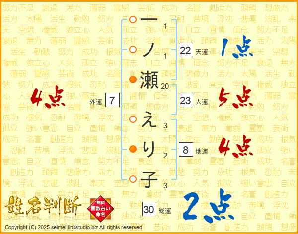 生活面を象徴する運勢です。外部から受ける影響力を表し、結婚運、家庭運や職場、環境への順応性を表します。総運から人運を引いた画数。姓や名が1文字の場合を除く。