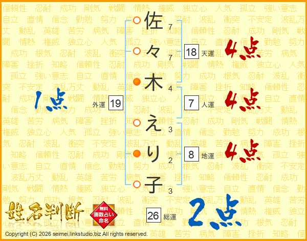 佐(7画)々(7画)木(4画) え(3画)り(2画)子(3画)