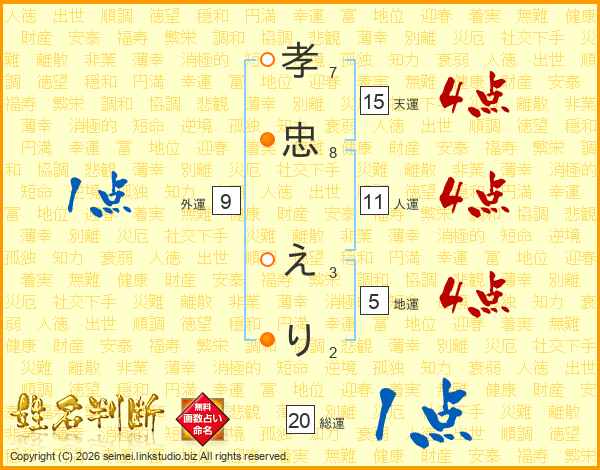 孝忠えりさんの総運は20画の1点!