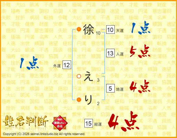 生活面を象徴する運勢です。外部から受ける影響力を表し、結婚運、家庭運や職場、環境への順応性を表します。総運から人運を引いた画数。姓や名が1文字の場合を除く。