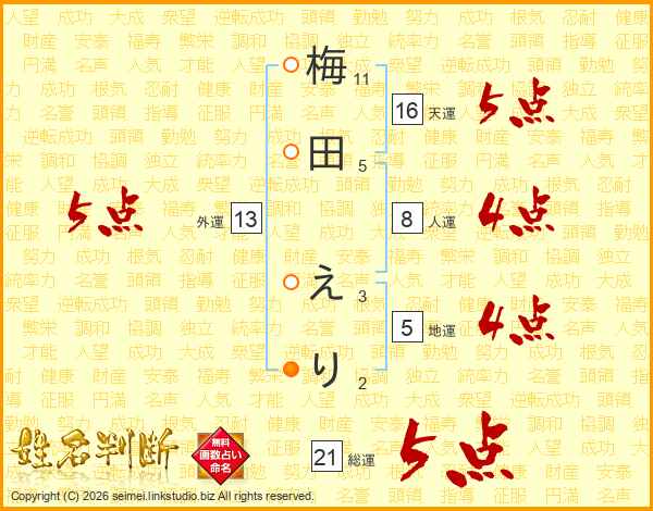 生活面を象徴する運勢です。外部から受ける影響力を表し、結婚運、家庭運や職場、環境への順応性を表します。総運から人運を引いた画数。姓や名が1文字の場合を除く。