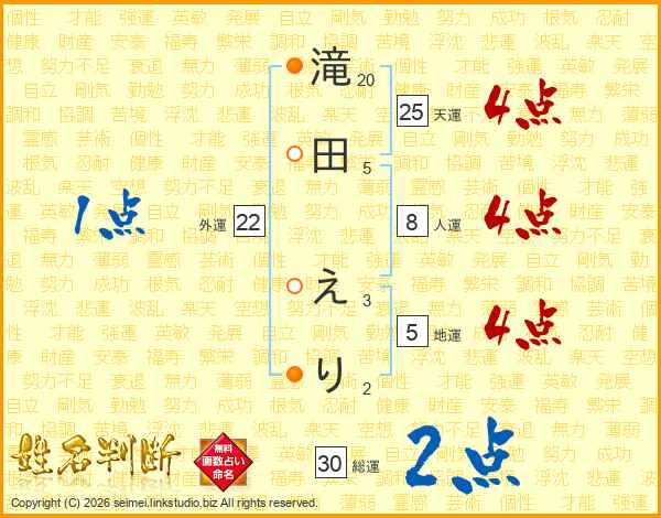 滝田えりさんの総運は30画の2点!