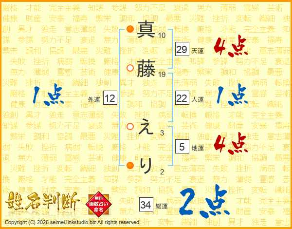 生活面を象徴する運勢です。外部から受ける影響力を表し、結婚運、家庭運や職場、環境への順応性を表します。総運から人運を引いた画数。姓や名が1文字の場合を除く。