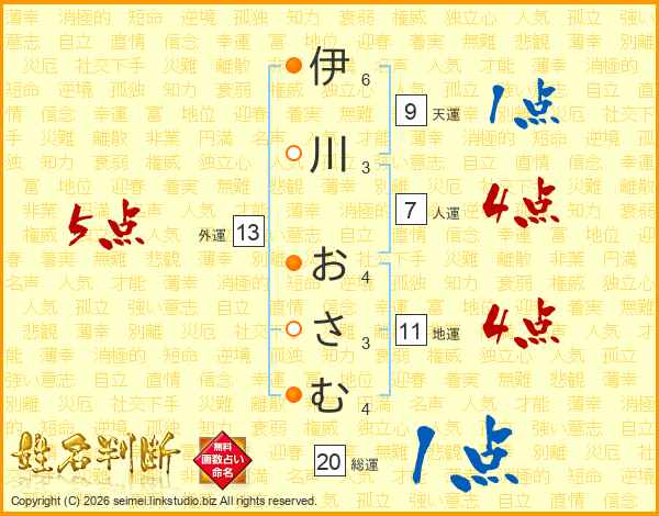 伊(6画)川(3画) お(4画)さ(3画)む(4画)
