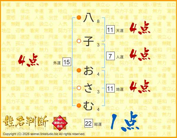 八(8画)子(3画) お(4画)さ(3画)む(4画)