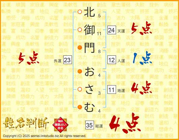 北(5画)御(11画)門(8画) お(4画)さ(3画)む(4画)