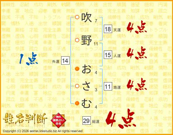 生活面を象徴する運勢です。外部から受ける影響力を表し、結婚運、家庭運や職場、環境への順応性を表します。総運から人運を引いた画数。姓や名が1文字の場合を除く。