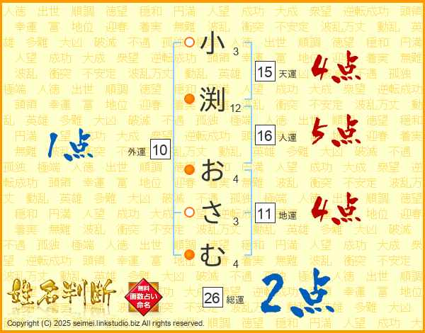 小(3画)渕(12画) お(4画)さ(3画)む(4画)