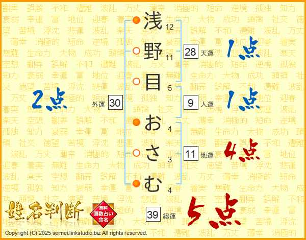 浅(12画)野(11画)目(5画) お(4画)さ(3画)む(4画)