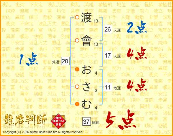 渡(13画)會(13画) お(4画)さ(3画)む(4画)