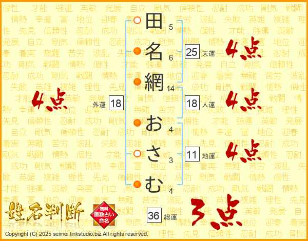 あなたの人生を表す1番重要な運勢です。生涯を通じて影響する総合運となり、主に50歳以降の晩年期に影響を及ぼします。苗字と名前の合計画数。