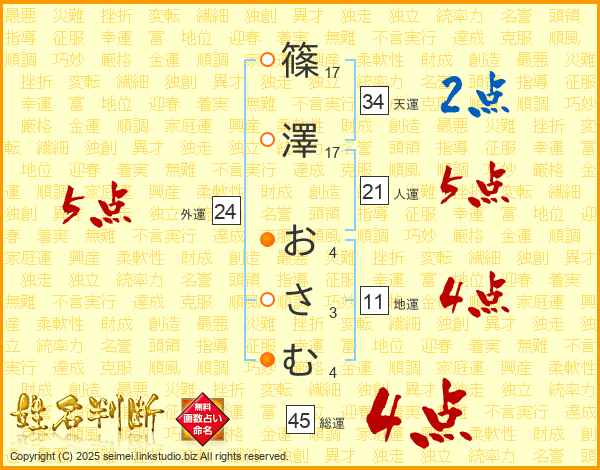 篠(17画)澤(17画) お(4画)さ(3画)む(4画)