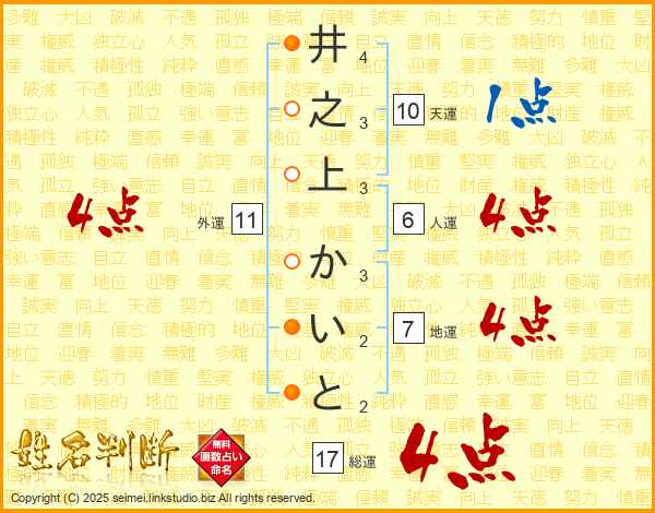 生活面を象徴する運勢です。外部から受ける影響力を表し、結婚運、家庭運や職場、環境への順応性を表します。総運から人運を引いた画数。姓や名が1文字の場合を除く。