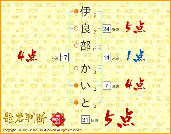伊(6画)良(7画)部(11画) か(3画)い(2画)と(2画)