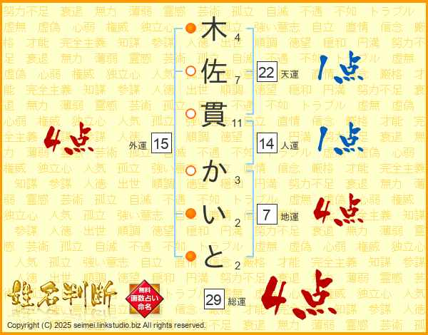 木佐貫かいとさんの総運は29画の4点!