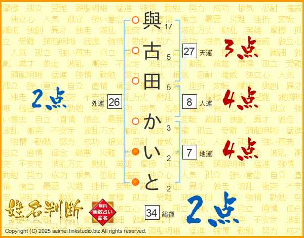 與(17画)古(5画)田(5画) か(3画)い(2画)と(2画)
