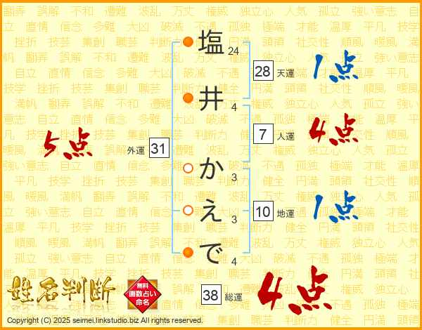 塩(24画)井(4画) か(3画)え(3画)で(4画)