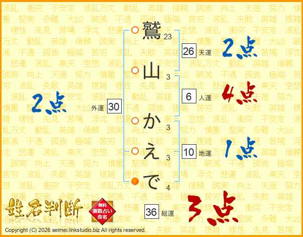 鷲(23画)山(3画) か(3画)え(3画)で(4画)
