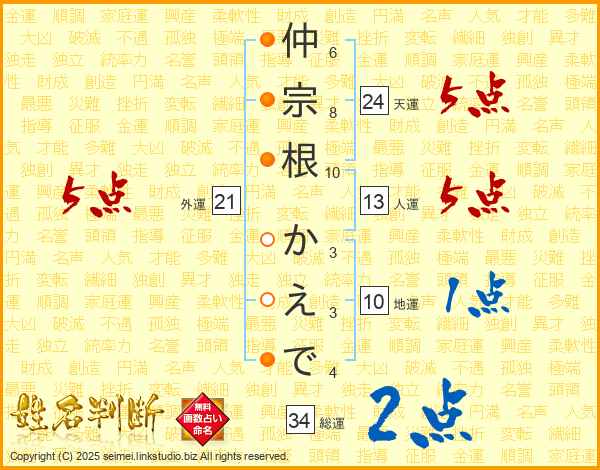 仲(6画)宗(8画)根(10画) か(3画)え(3画)で(4画)