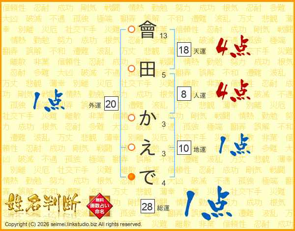 生活面を象徴する運勢です。外部から受ける影響力を表し、結婚運、家庭運や職場、環境への順応性を表します。総運から人運を引いた画数。姓や名が1文字の場合を除く。