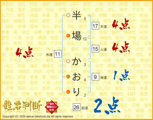 半場かおりさんの総運は26画の2点!