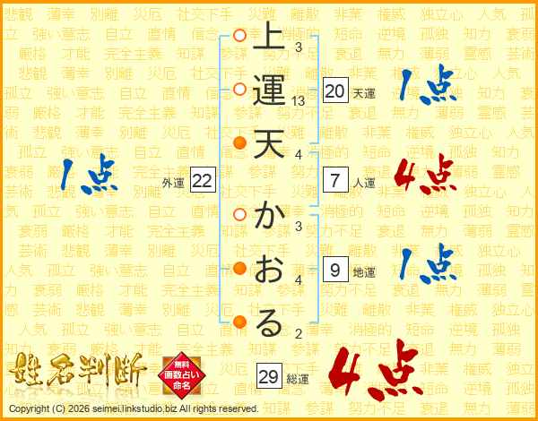 生活面を象徴する運勢です。外部から受ける影響力を表し、結婚運、家庭運や職場、環境への順応性を表します。総運から人運を引いた画数。姓や名が1文字の場合を除く。