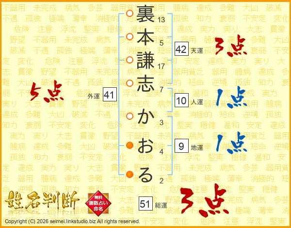 裏(13画)本(5画)謙(17画)志(7画) か(3画)お(4画)る(2画)