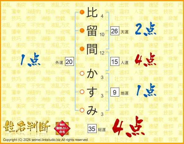 比(4画)留(10画)間(12画) か(3画)す(3画)み(3画)