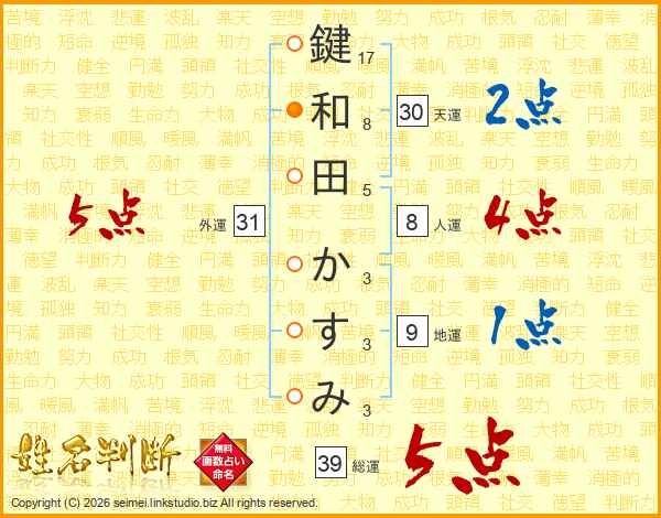 鍵和田かすみさんの総運は39画の5点!