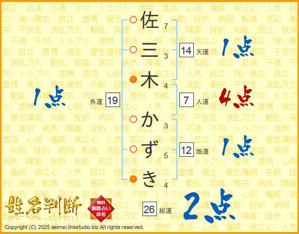 佐(7画)三(3画)木(4画) か(3画)ず(5画)き(4画)
