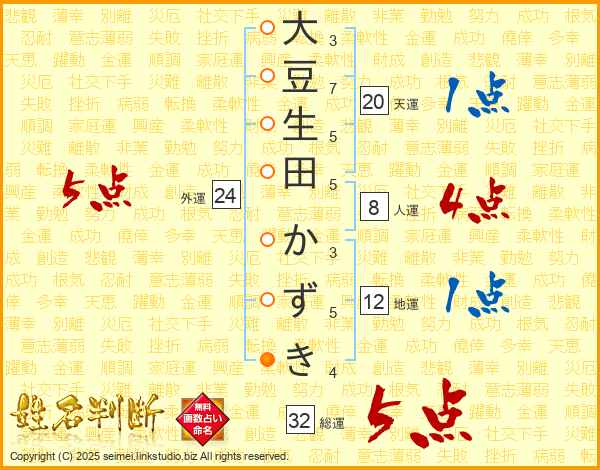 大(3画)豆(7画)生(5画)田(5画) か(3画)ず(5画)き(4画)