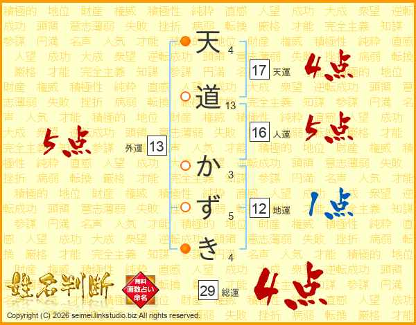 天(4画)道(13画) か(3画)ず(5画)き(4画)