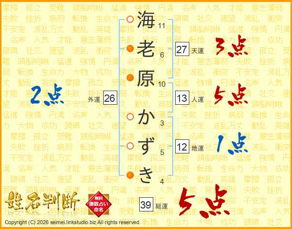海(11画)老(6画)原(10画) か(3画)ず(5画)き(4画)