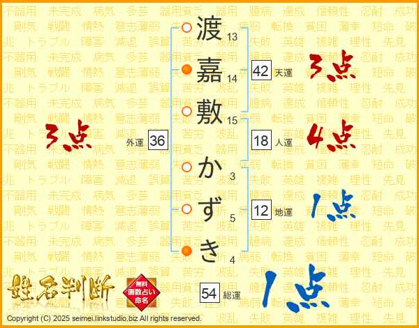 渡(13画)嘉(14画)敷(15画) か(3画)ず(5画)き(4画)
