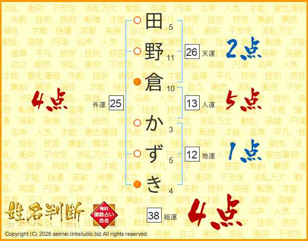 生活面を象徴する運勢です。外部から受ける影響力を表し、結婚運、家庭運や職場、環境への順応性を表します。総運から人運を引いた画数。姓や名が1文字の場合を除く。