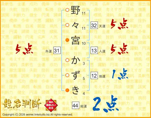 生活面を象徴する運勢です。外部から受ける影響力を表し、結婚運、家庭運や職場、環境への順応性を表します。総運から人運を引いた画数。姓や名が1文字の場合を除く。
