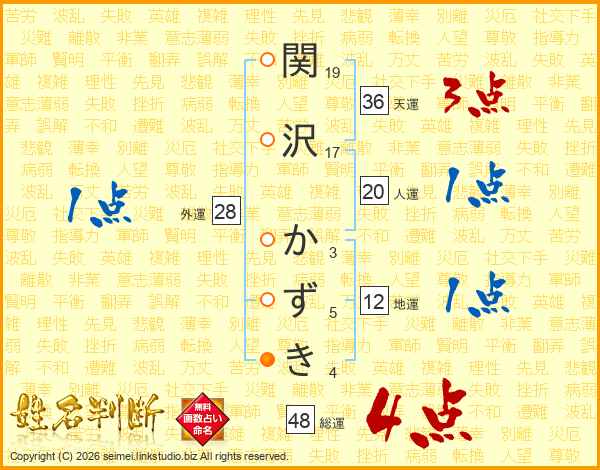 関(19画)沢(17画) か(3画)ず(5画)き(4画)