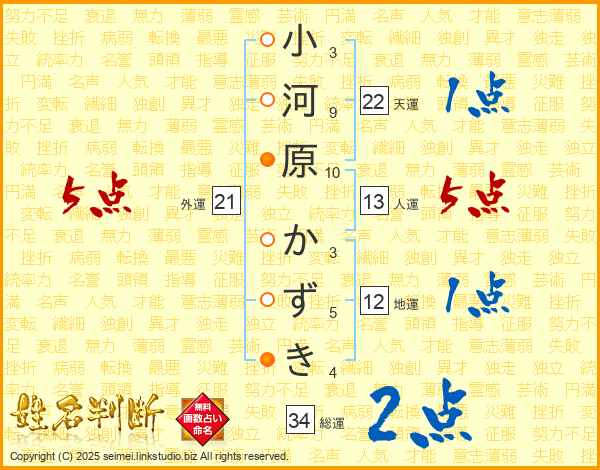 生活面を象徴する運勢です。外部から受ける影響力を表し、結婚運、家庭運や職場、環境への順応性を表します。総運から人運を引いた画数。姓や名が1文字の場合を除く。