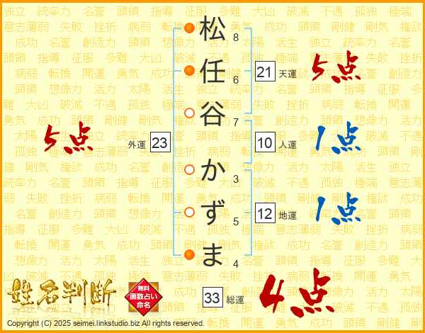 生活面を象徴する運勢です。外部から受ける影響力を表し、結婚運、家庭運や職場、環境への順応性を表します。総運から人運を引いた画数。姓や名が1文字の場合を除く。